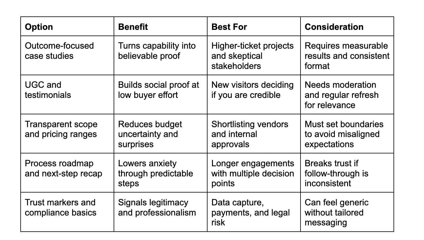 These options help you choose the right trust signals based on effort, likely impact, and fit for buyers who need clarity before committing. For business owners hiring creative and technical support, this framework makes it easier to prioritize what reduces risk fastest across your website, proposals, and client communication.